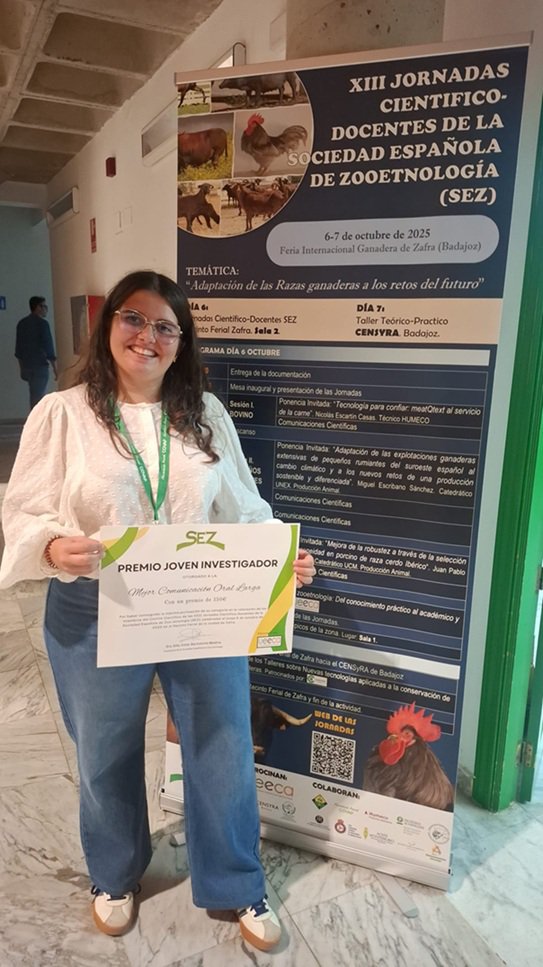 A Íris apresentou a comunicação oral com o tema "Correlación de peso y edad en éxito reproductivo en razas autóctonas españolas", desenvolvido no âmbito do seu estágio final de licenciatura e que decorreu no CENSYRA (Badajoz).